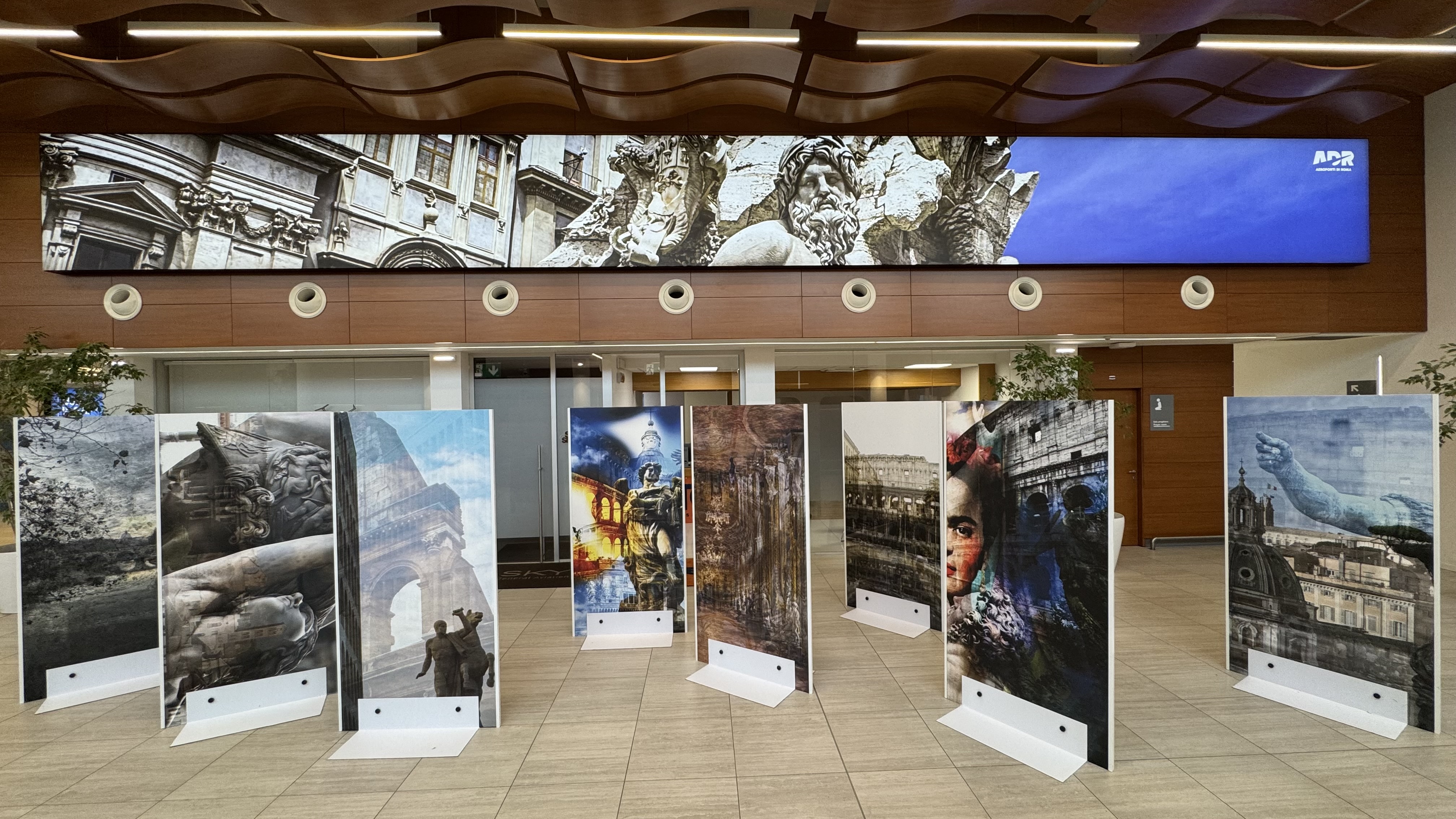 Amid the architectures of Fiumicino’s Terminal and, at Ciampino, within the spaces of General Aviation, Bramante’s works accompany travellers on a visual journey suspended between lightness and memory, between lived cities and imagined ones.
