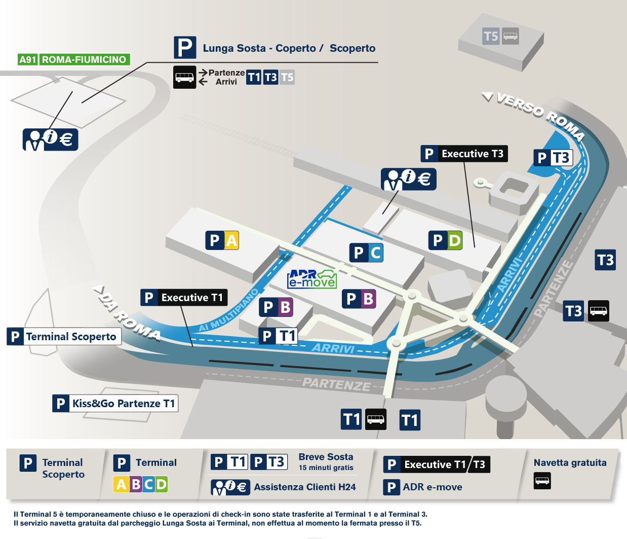 Le toilette si trovano al 3° piano dei parcheggi Multipinao P Terminal B-C-D e al piano terra e 2° piano del parcheggio multipiano P Terminal A.
